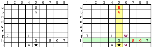 2 cells reservation and 3 cells reservation are applied techniques with number entry and scrutiny. Even if you do not know these applied techniques, you can get the same conclusions by entering numbers and reviewing them, but if you know them, you can answer faster. According to the 2 numbers of other area to be restricted, 2 numbers of 2 cells of the area concerned are reserved. In the case below, since the combination of 68 is in the yellow row 5 and the green column h, H (6 g) and H (6i) are decided (reserved) in 68, and only 7 is in ★. Thus, the technique to determine the cells of★ by the 2 cells reservations according to the other columns and rows even without a few scrutiny is called 2 cells reservation.